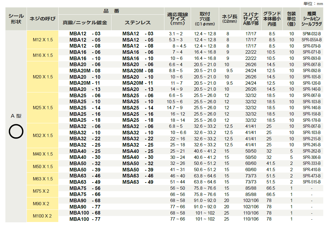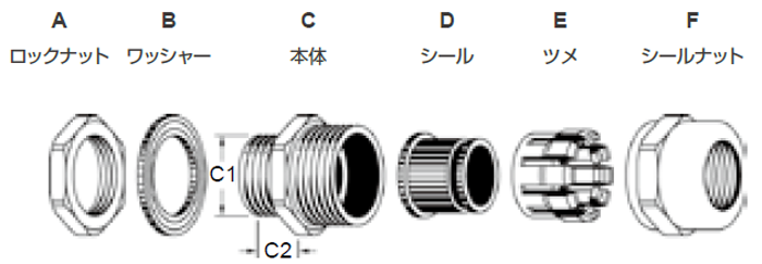 ・材質:ロックナット・本体・シールナット/真鍮・ニッケル鍍金=MBA